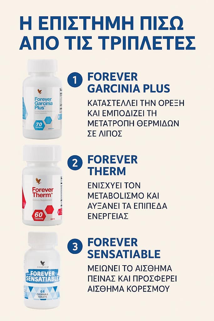 Η απώλεια περιττού βάρους δεν είναι απλή υπόθεση θερμιδικού ισοζυγίου. Ο βασικός μεταβολισμός, οι ορμόνες, η όρεξη, ακόμη και η καθημερινή μας δραστηριότητα αλληλεπιδρούν συνεχώς. Η Forever Living αξιοποίησε τη σύγχρονη διατροφική έρευνα και τη δύναμη φυτικών εκχυλισμάτων, δημιουργώντας έναν συνδυασμό τριών συμπληρωμάτων που συνεργάζονται αρμονικά για πιο εμφανή αποτελέσματα.